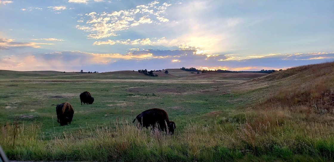 As I was driving in to the campground, I got my first look at a bison. He took me off guard because he was just hanging out right by the campground entrance! I pulled over and snapped a few photos. There will be no shortage of pictures of bison from this whole trip – but I have to commemorate my first π Also I didn’t realize they were so fuzzy on the front and smooth on the back! You can see the muscles near his hind legs. Good reminder not to get too close…along with those big horns.