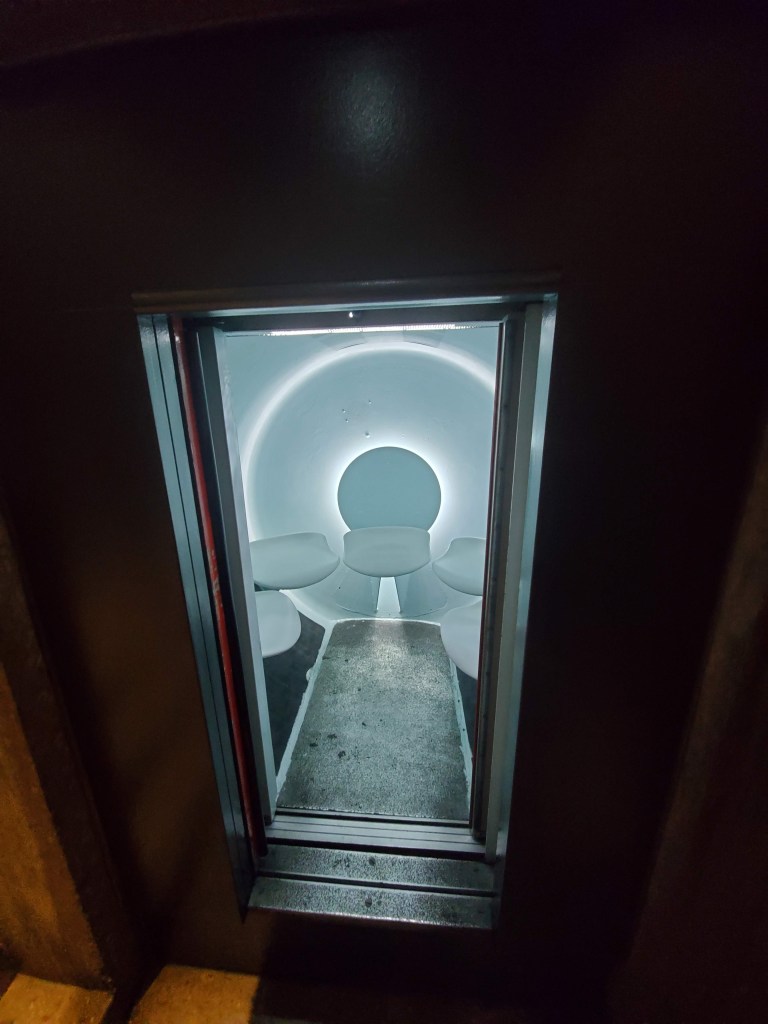 The best way I can describe this was that it looked like a little alien pod ship. Those doors from above opened about 4 feet tall and you sort of climbed into this little car. Even the lighting was a little eerie