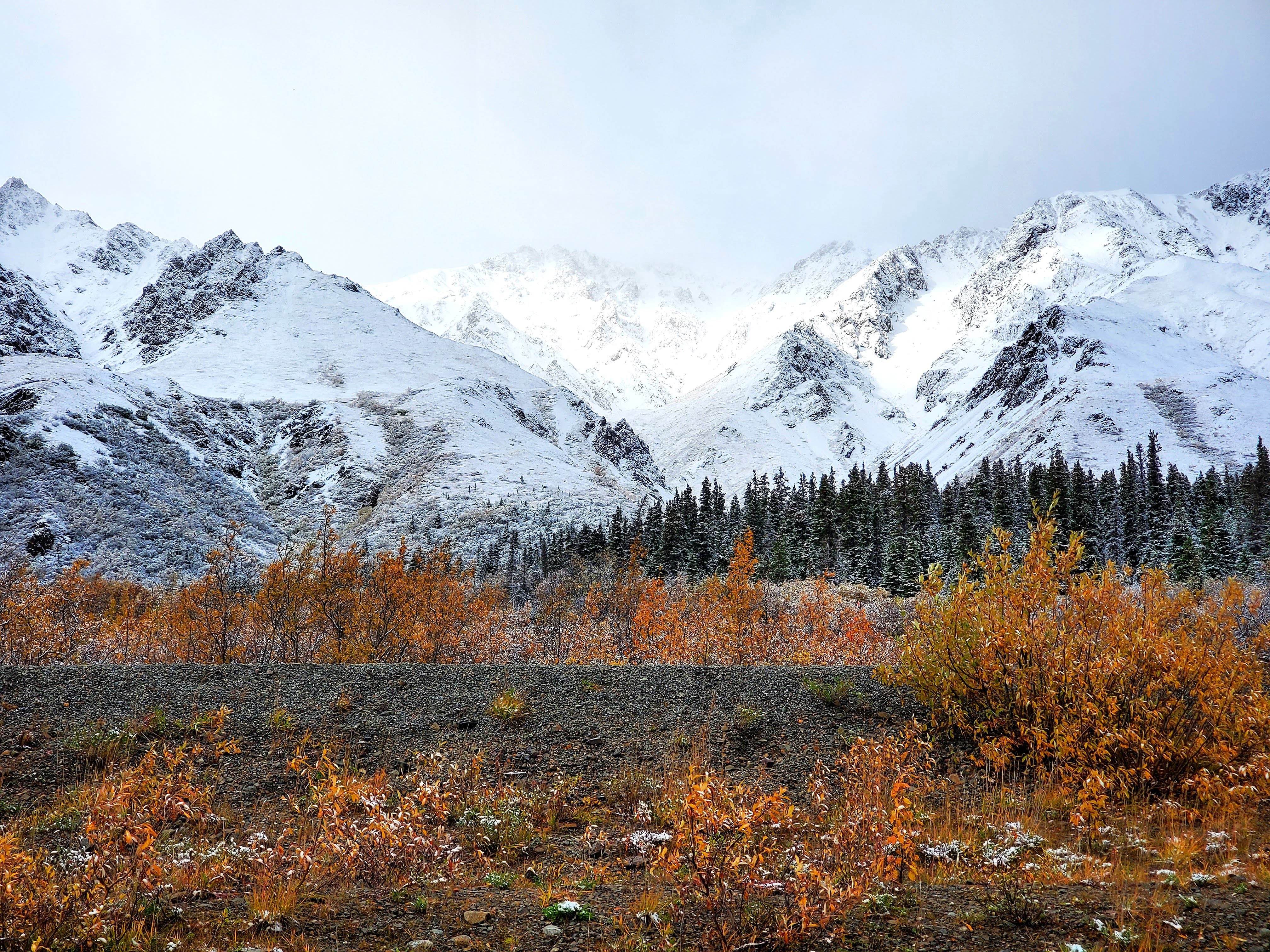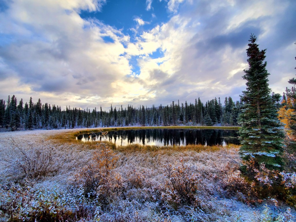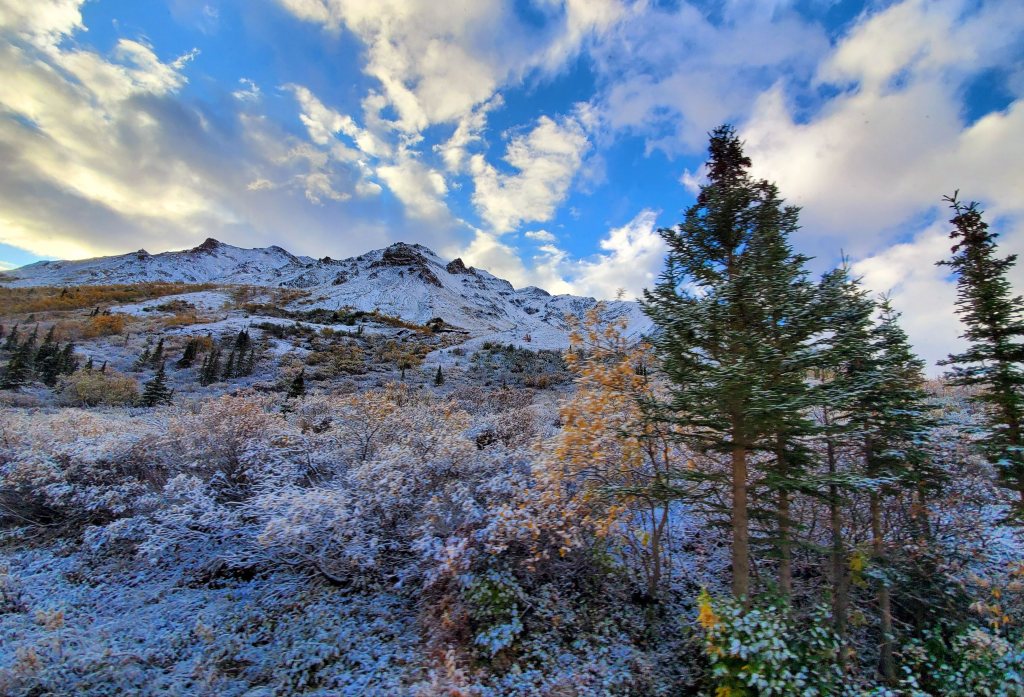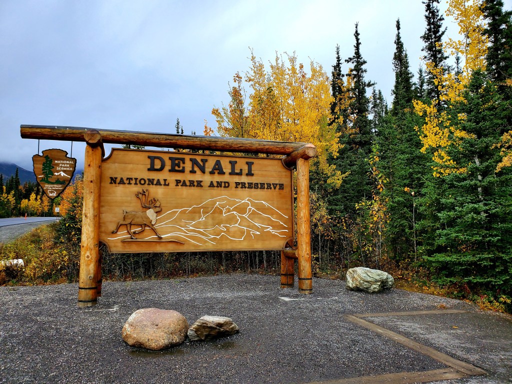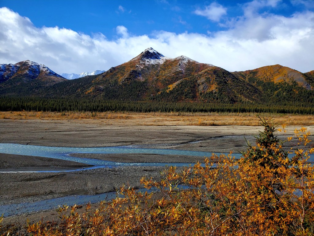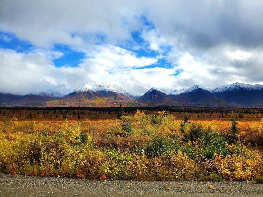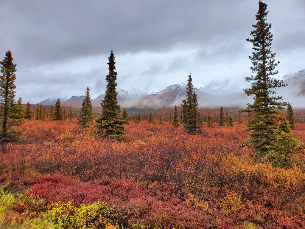 Coming in to Denali we got a few glimpses of the sun on a dreary day. It would come out and reveal the stunning scenery surrounding us! Mountain peaks and colorful trees – Alaska is amazing in the fall