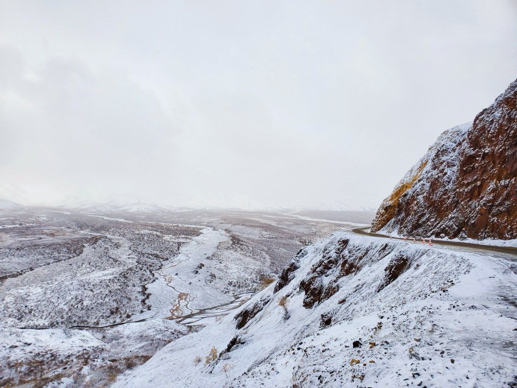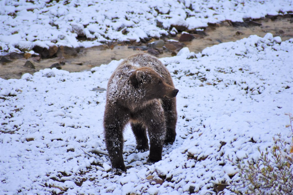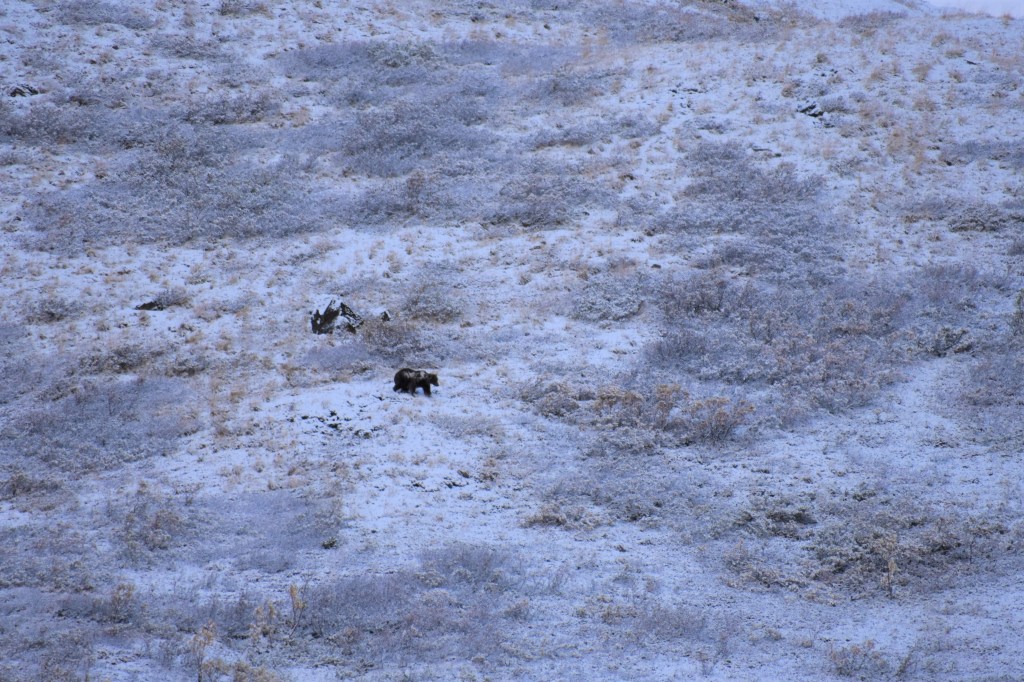 The next morning we woke up before the sun to catch our tour bus at the beginning of the park. Today we would get to travel further in than I’ve ever been before – 62 miles! Regular visitors can’t make it further than we did the previous day, which is about 15 miles from the visitor’s center. Overnight the ground had seen a fresh coating of snow. The tundra had more of a purple hue, frozen from the precipitation.