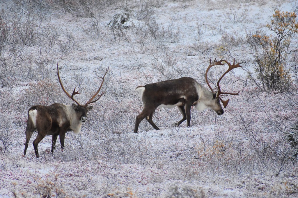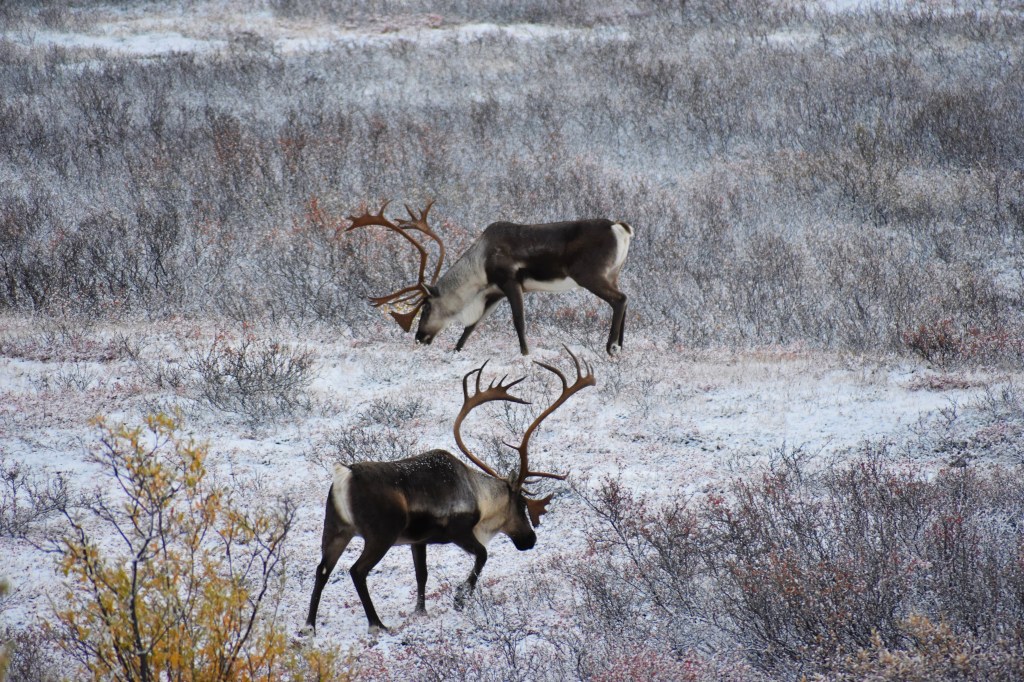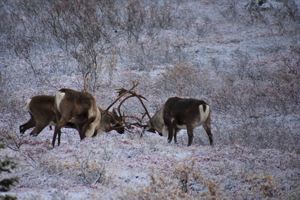 The caribou here are practicing for when they are in mating season. They were sparing and starting to figure out the pecking order. Once they were done they went right back to snacking on some brush.