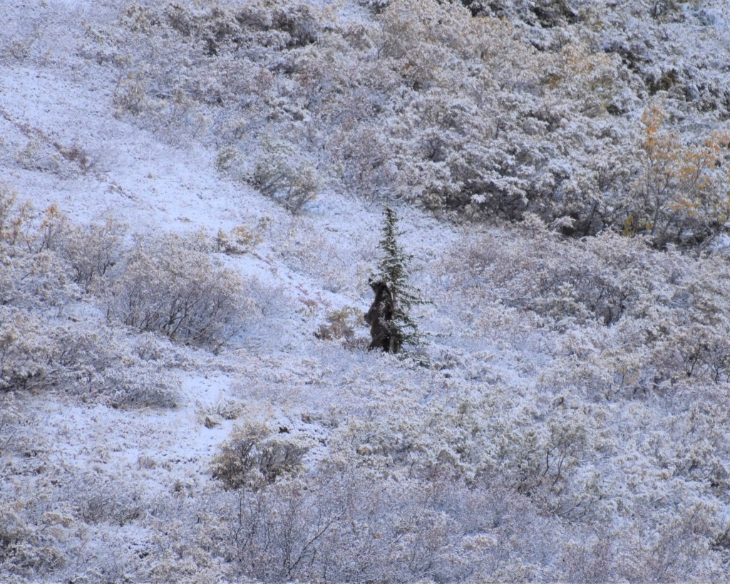 The tour bus ahead of us was stopped and watching the mountain side. When we all engaged our zoom lenses, we found the bear up on the top of the mountain. He was heading down slowly at first and stopping to scratch his back on a few trees.