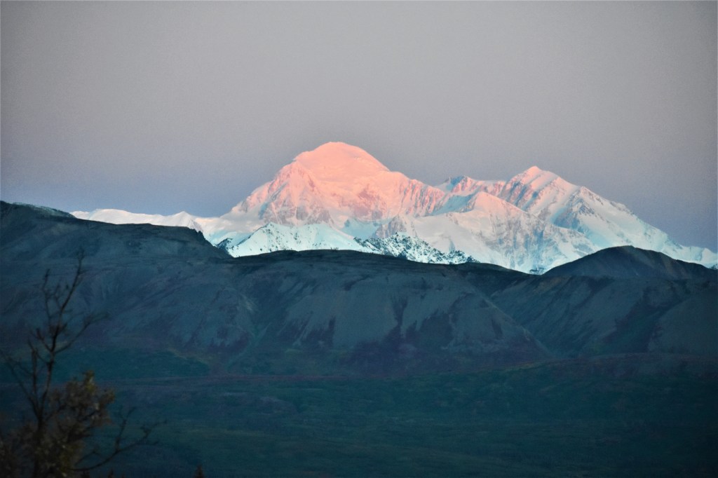 The next morning we got on our way back down to Talkeetna to catch our flight seeing tour. The weather had cleared up beautifully and the majestic peak of Denali was finally in full view!! Love it with the soft pink hue as the sun struck it for the first time that day. We were part of the 30% for sure – as they say Denali is only visible about 30% of the time.