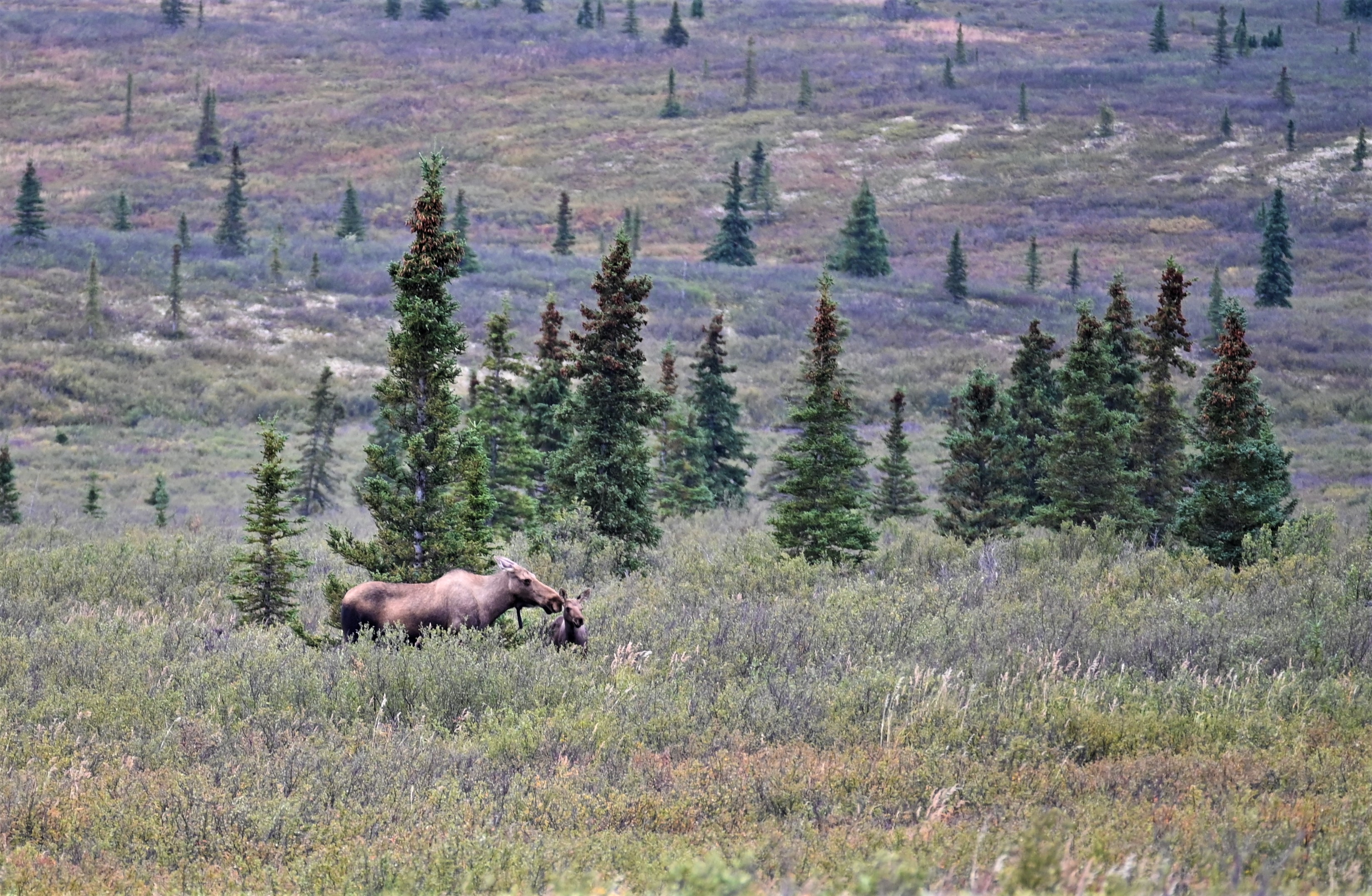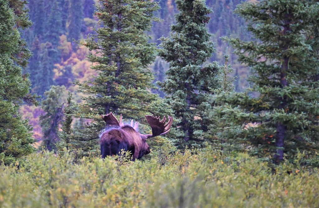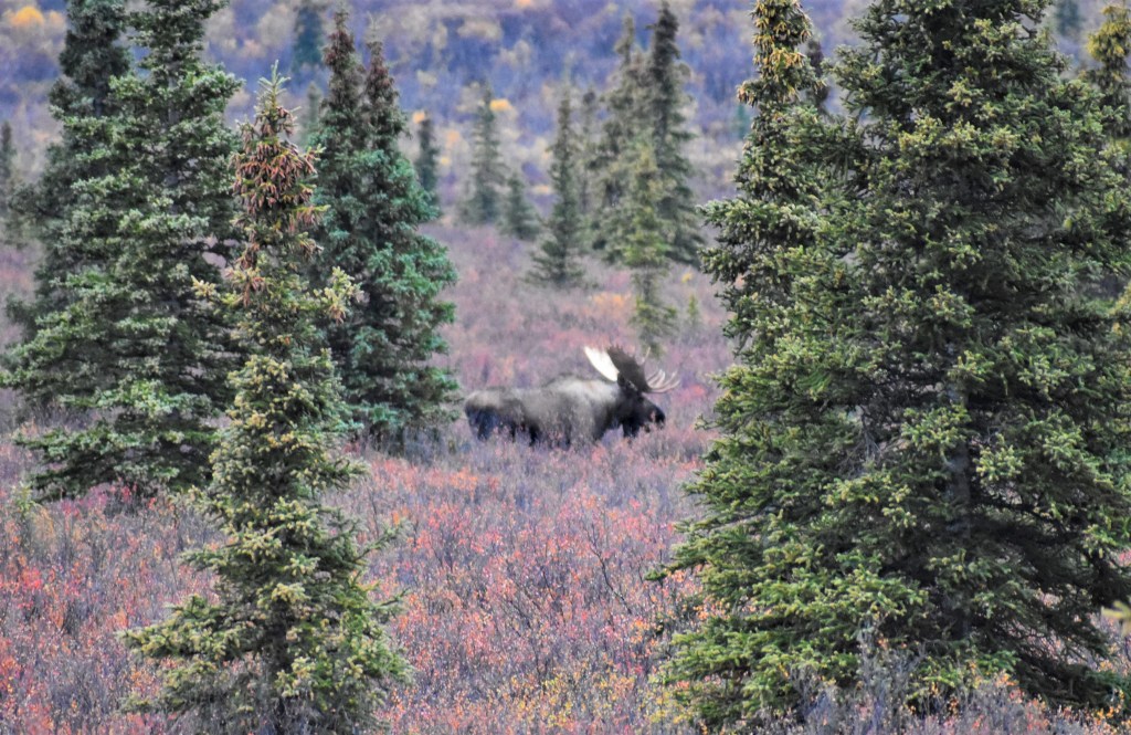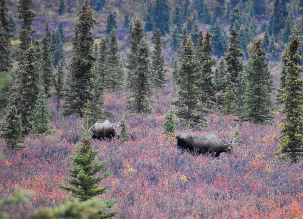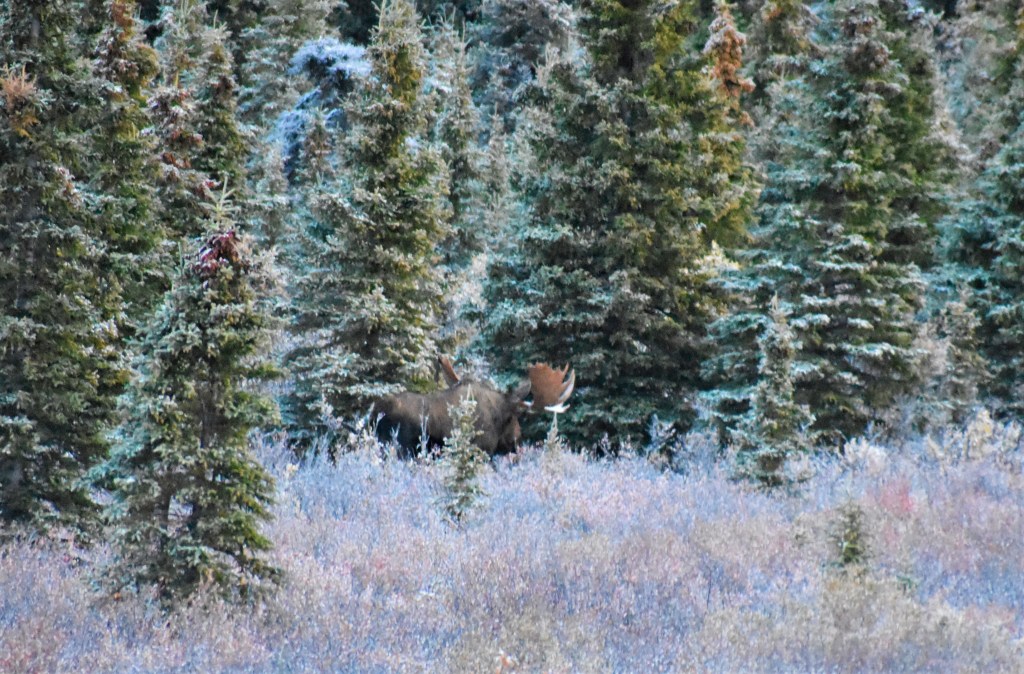 We arrived at the park earlier than expected on Day 1 due to our flight tour being rescheduled. We decided to drive in to the park as far as we could to see what we could see. As usual for me – I didn’t spot any wildlife but I did spot other people spotting wildlife! There was a bull moose and two cows off in the trees. Full disclosure, I was clearly riding the struggle bus with my auto focus taking pictures of them moving through the trees. None of my moose pictures turned out great, but it was still proof of the sighting!
