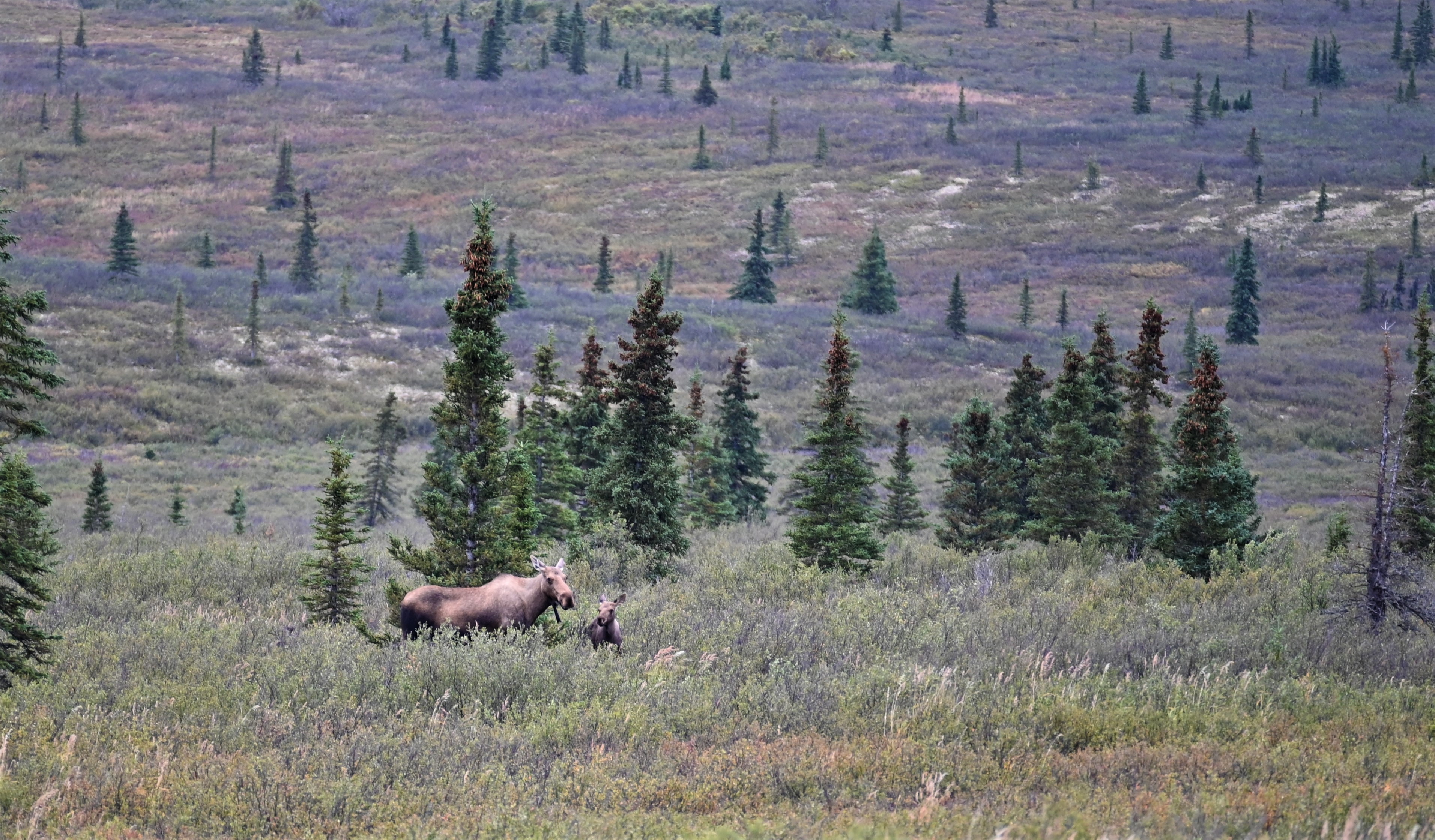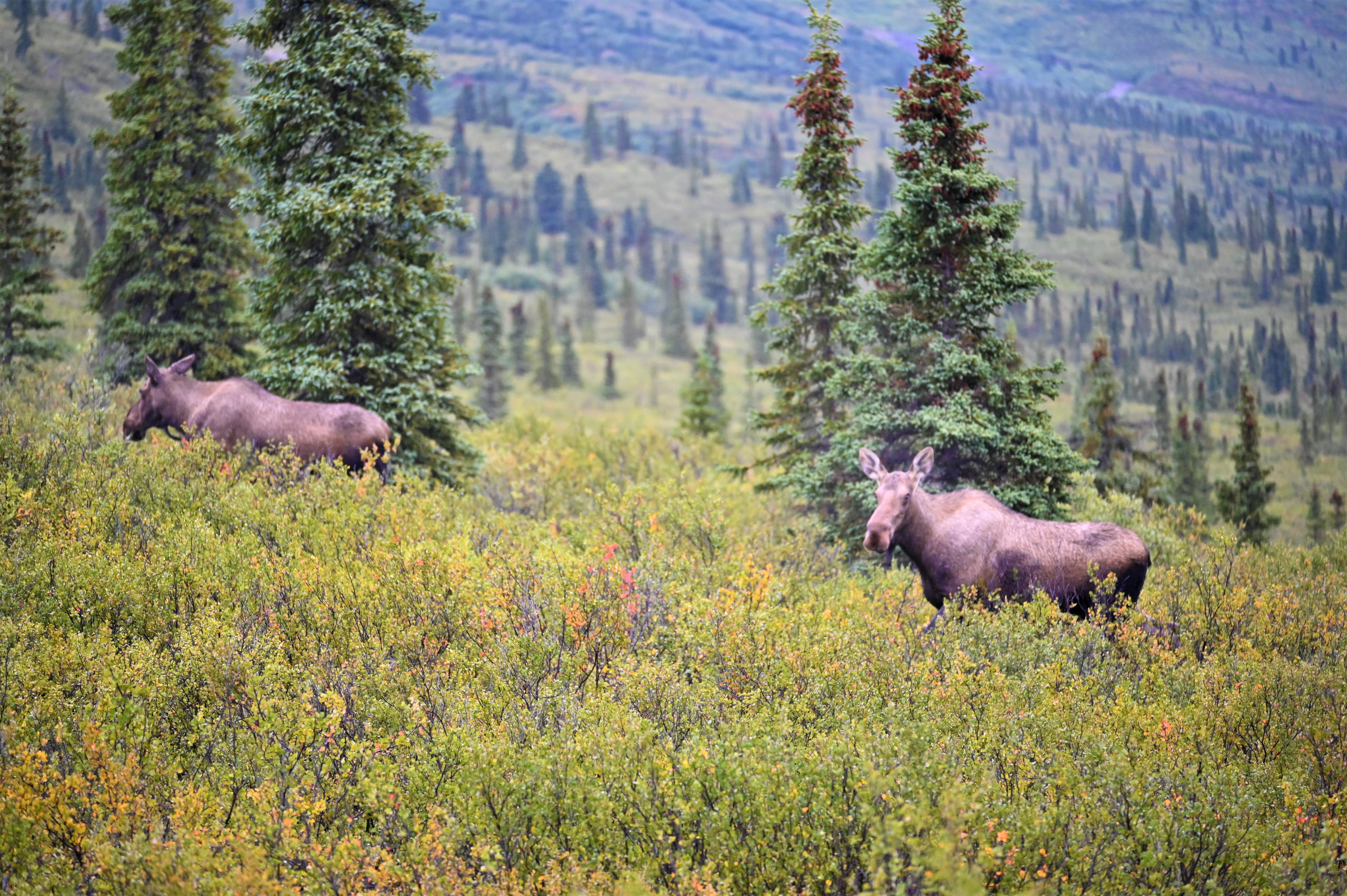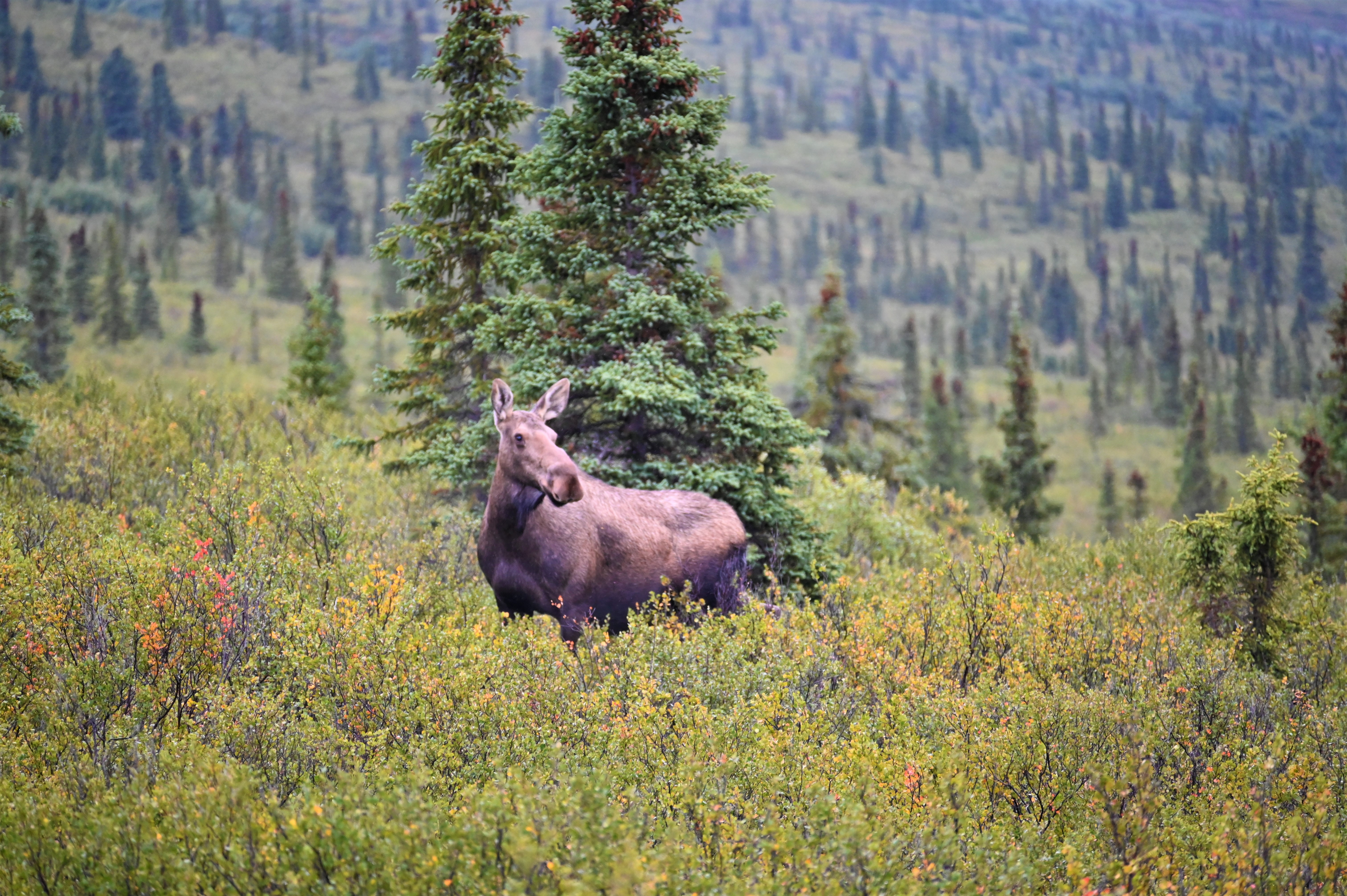 We arrived at the park earlier than expected on Day 1 due to our flight tour being rescheduled. We decided to drive in to the park as far as we could to see what we could see. As usual for me – I didn’t spot any wildlife but I did spot other people spotting wildlife! There was a bull moose and two cows off in the trees. Full disclosure, I was clearly riding the struggle bus with my auto focus taking pictures of them moving through the trees. None of my moose pictures turned out great, but it was still proof of the sighting!