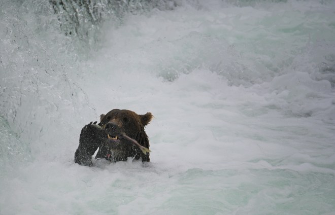 Best action shot!! Got it right as his mouth clamped down on the fish. The bears were not as good at fishing as I would have expected! But they do catch them sometimes.