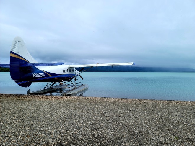 Our day started with our air flight service saying there was a 50% chance we wouldn’t be able to fly from King Salmon to Katmai due to weather…Even with those odds everyone climbed on the plane from Anchorage to King Salmon. The chance to see some of these bears at the falls was well worth the potential cancellation and boring day in King Salmon! Also easy for me to say now – since we did end up getting to go! If not this post would be a lot less exciting. Below is a picture of our plane on the beach in Katmai!